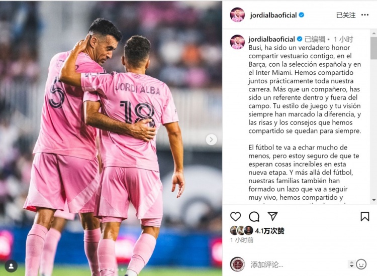 阿尔巴社媒晒出与布斯克茨的合照,并写道:“布斯克茨,能与你在巴萨、西班牙队以及迈阿密国际共用更衣室,这是我的莫大荣幸。我们几乎整个职业生涯都并肩作战。你不仅是队友,更是场上场下的榜样。你的球风与视野始终独树一帜,那些欢笑与建议将永远铭刻于心。
