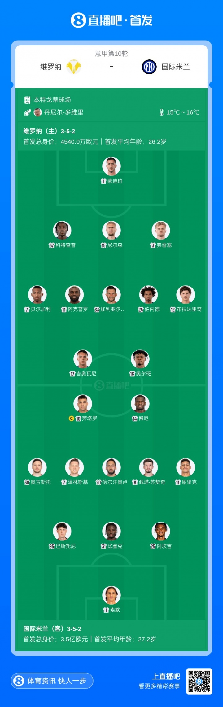 11月02日讯 北京时间19点30分,意甲第10轮,维罗纳vs国米,赛前双方杆位公布!【本场赛事 国米方面,劳塔罗、博尼搭档锋线,英超直播在线高清(无插件)恩里克得到杆位机会,巴雷拉、迪马尔科、邓弗里斯后备 待命。】