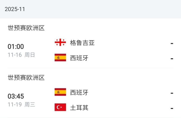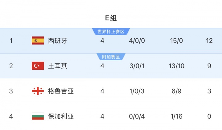 本期国家队赛事 日,西班牙队将分别对阵格鲁吉亚和土耳其,球队目前在欧预赛E组四战全胜排名榜首。