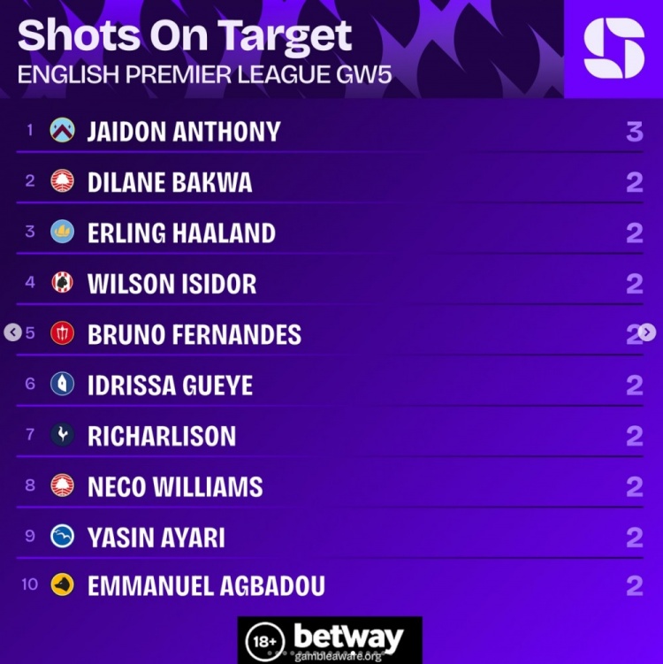 英超第5轮射正榜:杰顿-安东尼3次居首,哈兰德等9名球员两次
