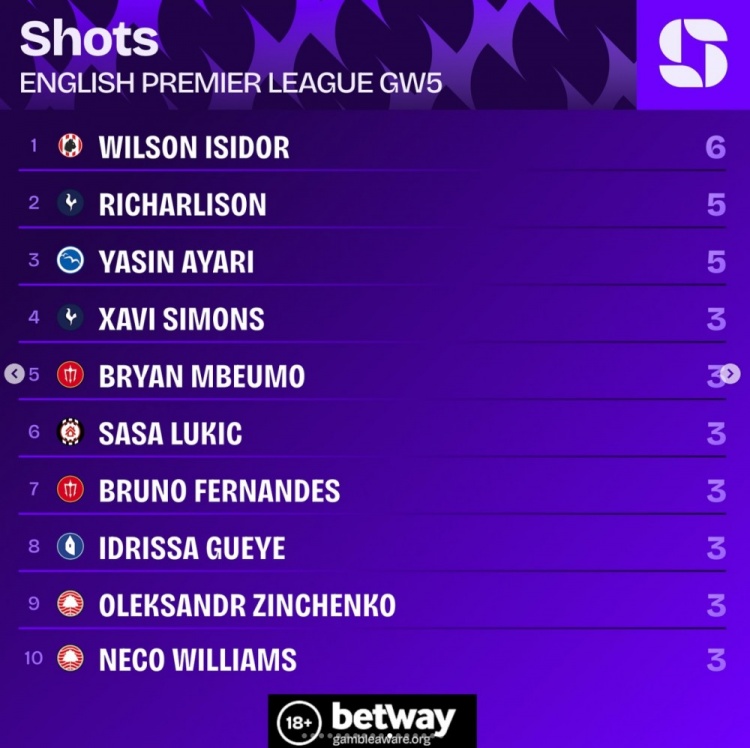 英超第5轮射球 榜:伊西多6次居首,理查利森、亚辛-阿亚里5次第二