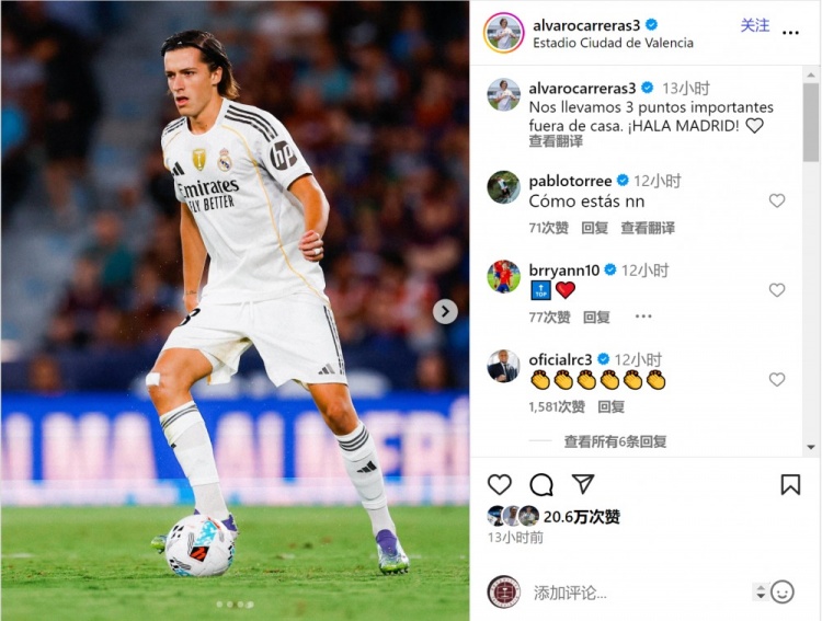 卡雷拉斯社媒晒出赛事 照片,英超免费高清直播庆祝球队取胜,他写道:“我们在客场应战 拿下重要的3分!Hala Madrid!”