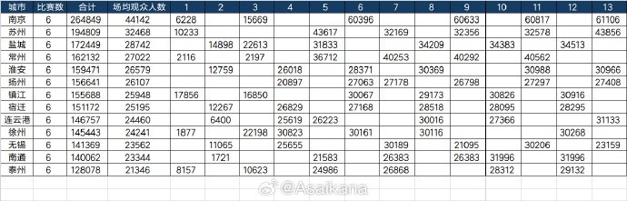 2025江苏省城市古代足球 职业联赛 (“苏超”)常规赛阶段13轮78场赛事 全部结束,整个出回合赛阶段现场观赛人群 人数达2118920人次,英超直播场均27166人。南京队6个主场作战 赛事 总观赛人群 人数为264849人,是现场观赛人群 人数最多的主场作战 城市;苏州(194809人)、盐城(172449人)分列二、三位。
