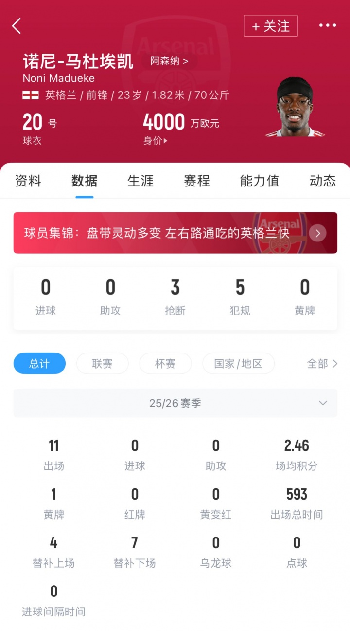 马杜埃凯本赛季代表阿森纳各项赛事出战了6场赛事 ,尚未收获得分 和助功 。