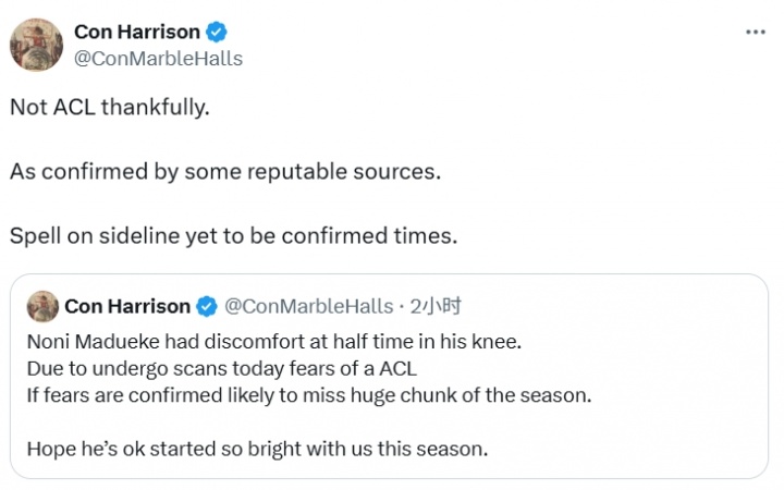 【后续】记者更新消息:“幸好不是前十字韧带伤,一些可靠信源也证实了这一消息。球员伤缺的时间仍未确定。”