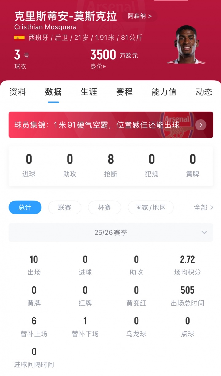 10月27日讯 阿森纳本轮1-0小胜水晶宫,继续占据英超榜首,21岁的莫斯克拉下半场顶替萨利巴出战,表现稳健并助枪手守住零封胜果,赢得枪迷称赞。