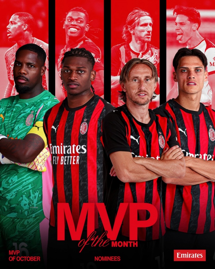 米兰10月最佳候选:迈尼昂(守门员)、莱奥(翼锋)、莫德里奇(中前卫)、里奇(中前卫)。