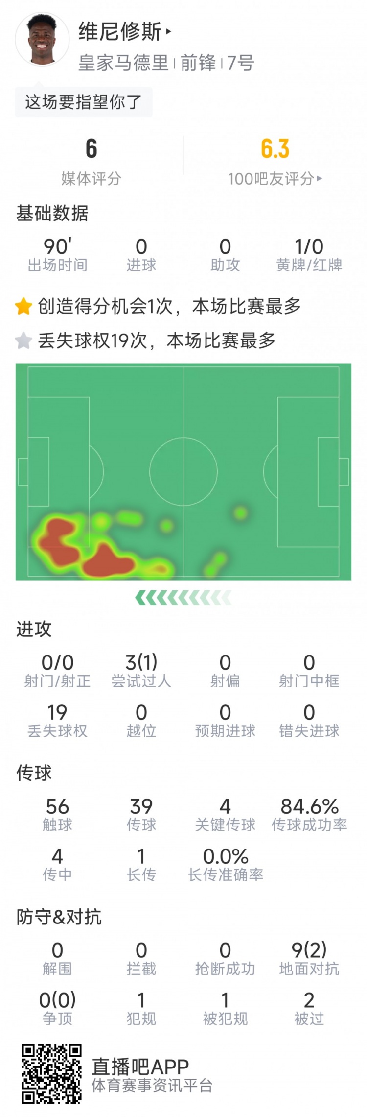 维尼修斯本场数据:0射球 ,4次关键传送球 ,9次对峙 仅2次成功