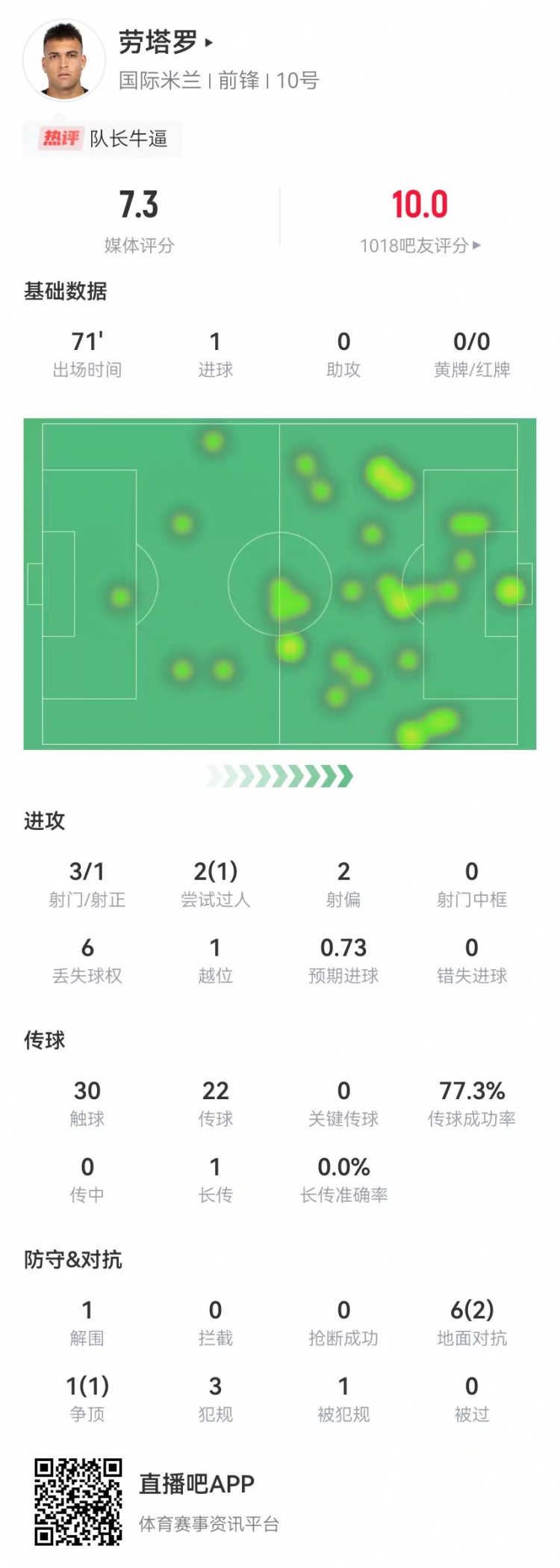 劳塔罗本场3射1正进1球+1越位违例 7对峙 3成功+3违例 获评7.3分
