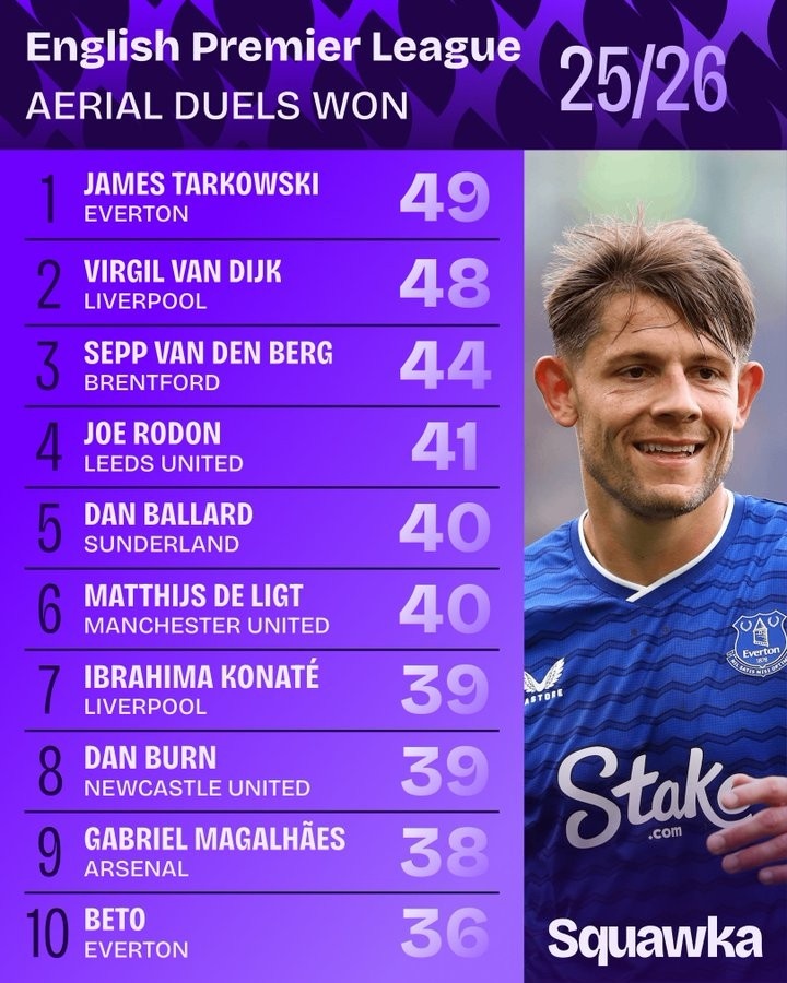 11月11日讯 英超职业联赛 已经进行了11轮,squakwa也统计了本赛季英超空中成功对峙 次数,英超直播塔科夫斯基力压范戴克居首。