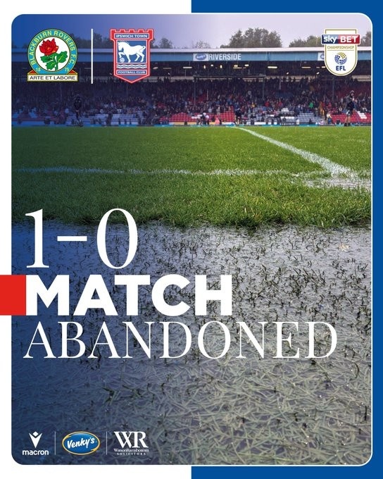 布莱克本凭借坎特维尔的十二码球以1-0领跑 ,且赛事 仅剩11分钟,伊普斯维奇的雅各布-格雷夫斯还被驱逐 罚下。但由于暴雨侵袭,赛事 被迫取消,工作人员无法将运动活动 场 复健 到可赛事 竞技状态 。