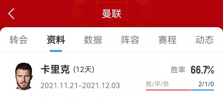 曼联2021年解雇主帅索尔斯克亚后,卡里克曾短暂担任曼联的临时主帅。他带队的3场赛事 保持不败,包括在欧冠中战胜黄潜,以及职业联赛 中战胜阿森纳。