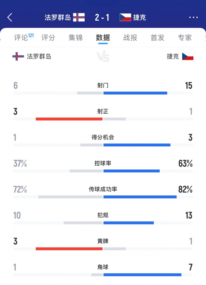 数据方面,捷克15次射球 仅1次射正进1球、盘带时间 63%,法罗群岛6次射球 3次射正打进2球、盘带时间 37%。