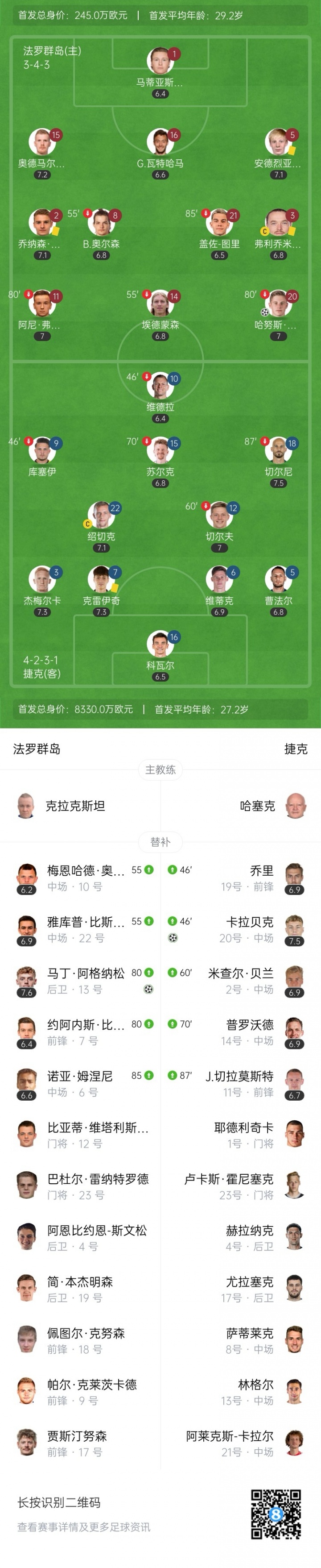 本场赛事 ,法罗群岛杆位身价仅245万欧,而捷克杆位身价高达8330万欧,是对手的34倍!