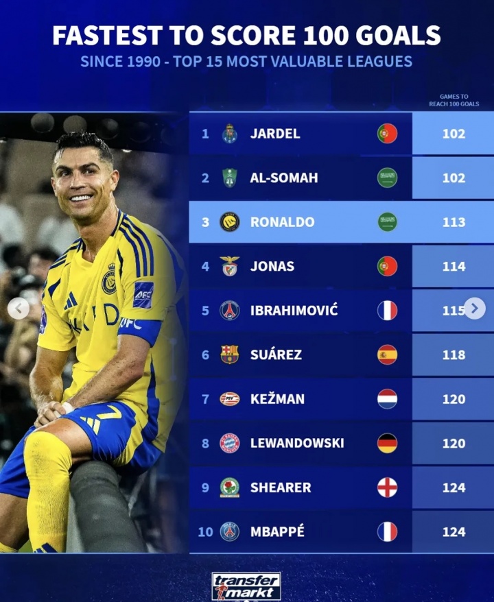 近35年为单支球队最快打进百球榜:C罗113场第三,伊布、莱万在列