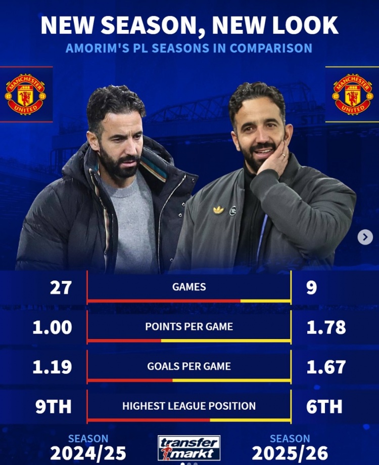 提升!阿莫林本赛季英超场均1.78分+1.67球,上赛季仅1分+1.19球