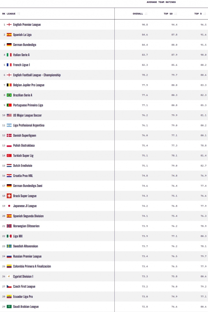全球职业联赛 实力排名:英超西甲德甲领跑,沙特联第29,中超第107