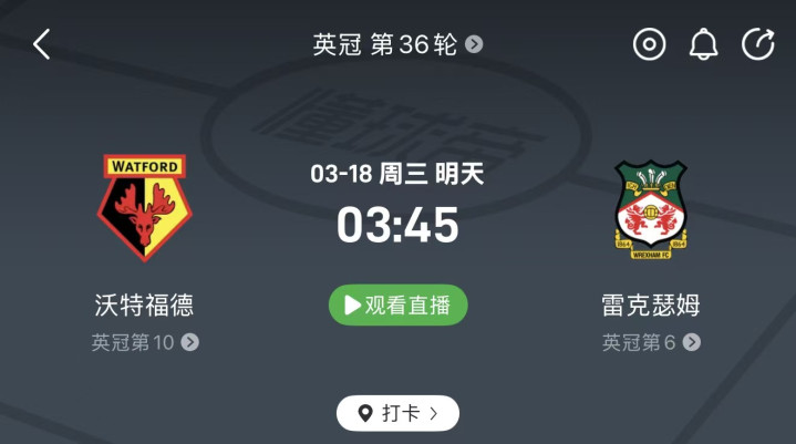 🔹 周二005 英冠:沃特福德 vs 雷克斯汉姆(03:45)