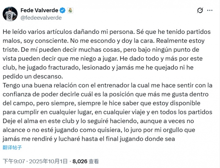 10月01日讯 巴尔韦德发布社媒,回应此前媒体报道称自己拒绝出战的说法,他表示自己与指导教练员关系很好,愿为皇马付出一切。