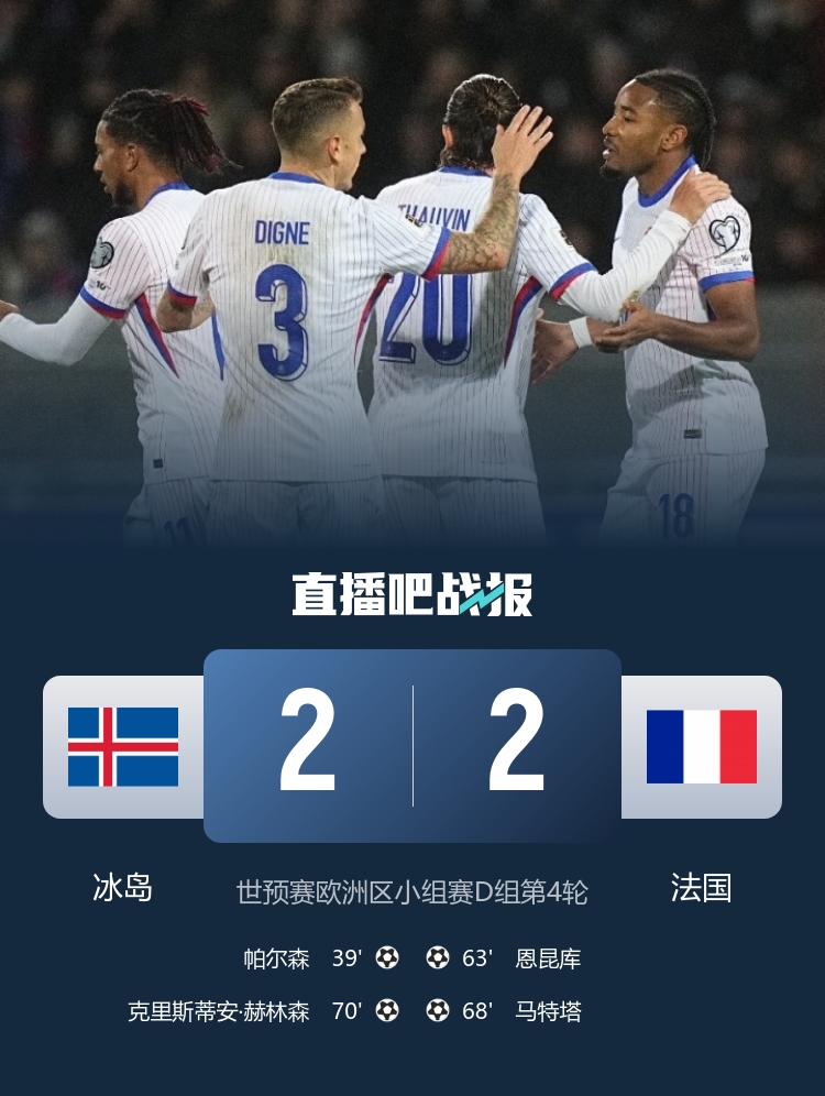法国本轮世预赛2-2战平冰岛,本场恩昆库、马特塔得分 。