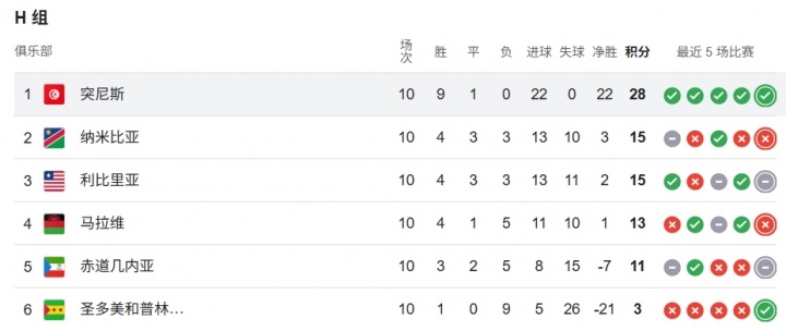 世预赛非洲区小组赛H组今天结束了最后一轮的全部较量,最终突尼斯以10轮28分,进22球失0球的无解战绩小组第一收官。