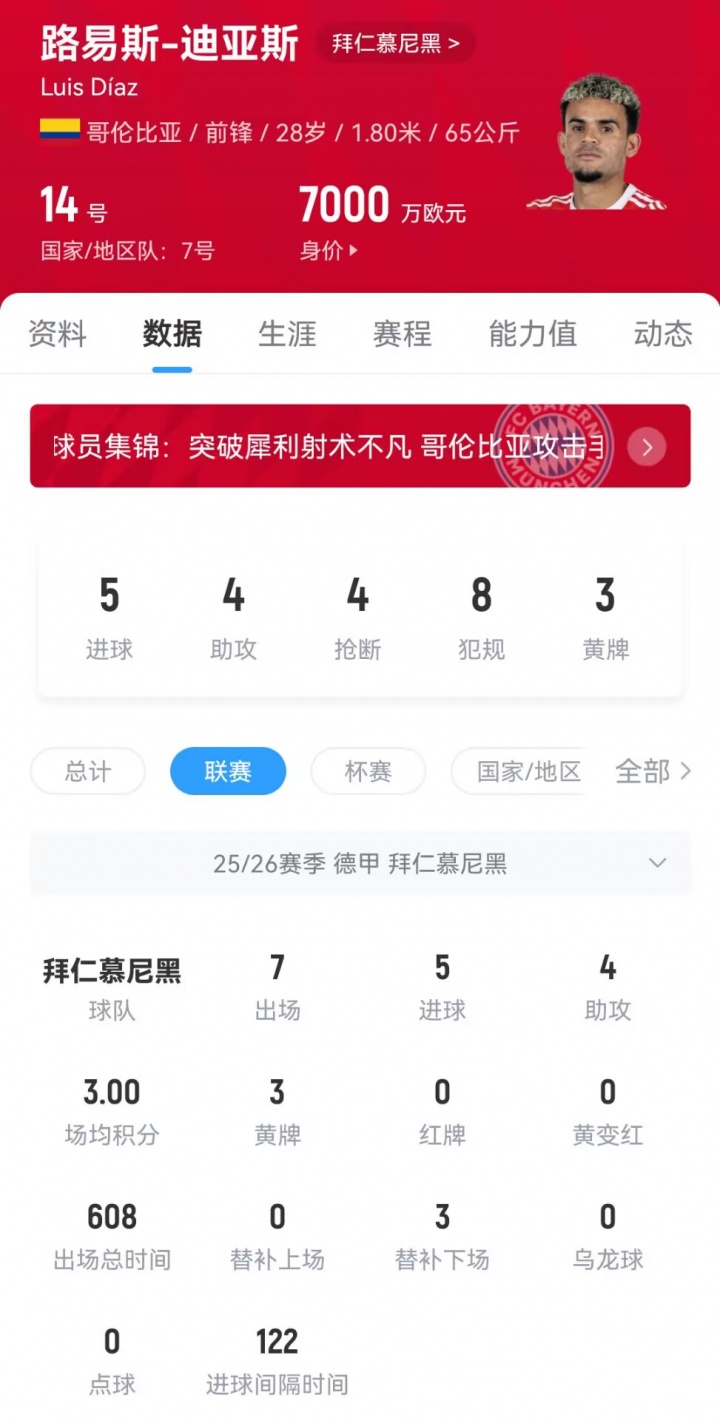 红军球迷们想念吗?迪亚斯德甲7场轰5球4助 夏窗7500万欧加盟拜仁
